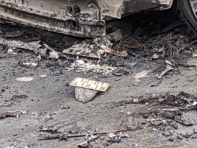 Hiện trường vụ xe Mercedes cùng 2 xe máy, 1 xe đạp bị cháy trơ khung sau khi xe Mercedes gây tai nạn liên hoàn vào sáng ngày 20/11.