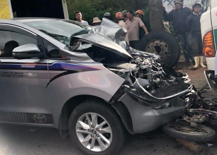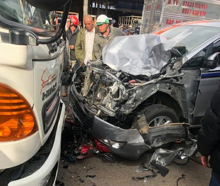 Không dừng lại ở đó, chiếc xe ô tô tiếp tục đẩy chị Phạm Thị Ngọc Anh cùng xe máy lao vào đầu xe tải biển số 49C - 182.00 đang dừng thay lốp bên đường. Hậu quả, chị Phạm Thị Ngọc Anh tử vong, chiếc xe của chị bị cuốn vào gầm xe ô tô 7 chỗ, xe ô tô 7 chỗ hư hỏng nặng phần đầu.