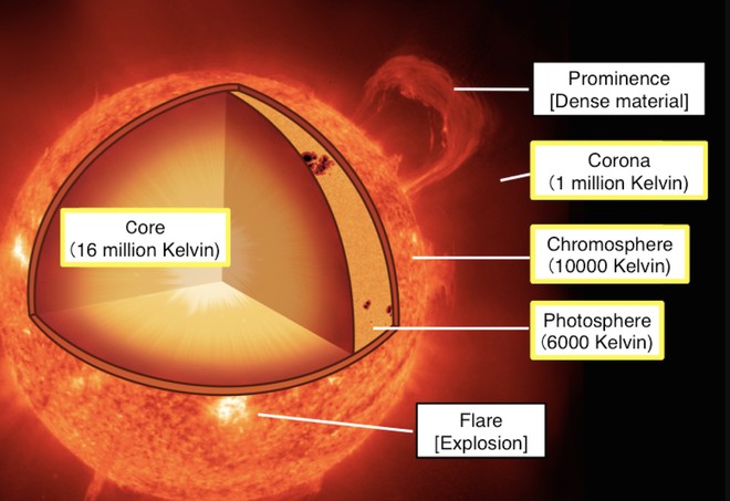 Lớp lõi, các lớp trong khí quyển mặt trời và nhiệt độ của chúng. Ảnh: JAXA.
