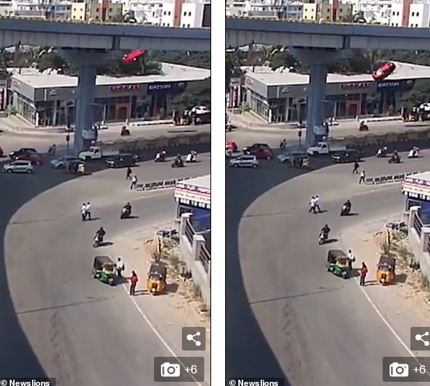 Theo Daily Mail, vụ việc xảy ra tại thành phố Hyderabad, Ấn Độ. Một người phụ nữ đang đứng chờ xe buýt bỗng nhiên bị ôtô “từ trên trời rơi xuống” đè trúng, gây tử vong tại chỗ. Chiếc xe còn khiến 6 người khác bị thương.