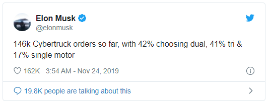 Thứ Bảy vừa qua, ông Musk đã đăng tải dòng tweet cho biết, 146.000 chiếc Cybertruck đã được đặt trước. Trong số đó, 41% đơn đặt hàng dành cho phiên bản 3 động cơ đắt tiền nhất và 42% khách hàng tương lai chọn phiên bản 2 động cơ. 17% còn lại thuộc về phiên bản một động cơ ít tiền nhất.