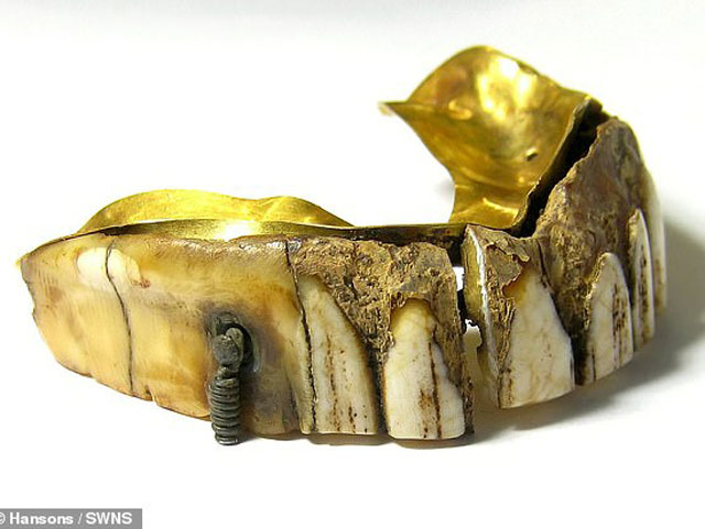 Bộ răng giả khá độc đáo khi kết hợp giữa ngà hà mã hoặc hải mã và vàng. Ảnh DailyMail