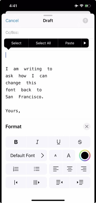 Kể từ iOS 9, Apple bắt đầu sử dụng phông chữ San Francisco của chính mình làm phông chữ mặc định trên iOS, thay cho phông chữ Helvetica. Tuy nhiên, có một điều rất lạ là phông chữ San Francisco này không xuất hiện dưới dạng một lựa chọn trong danh sách phông chữ trên các ứng dụng hỗ trợ phông tùy chỉnh, điển hình là ứng dụng Mail. Trên ứng dụng Mail, sau khi bạn chọn phông tùy chỉnh, bạn sẽ không tìm thấy tùy chọn quay về phông San Francisco mặc định.