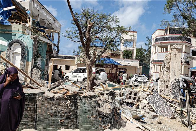 Hiện trường một vụ đánh bom liều chết do các phần tử khủng bố al-Shabab tiến hành khiến ít nhất 26 người thiệt mạng tại Kismayo, Somalia, ngày 13/7/2019. Ảnh: AFP/TTXVN