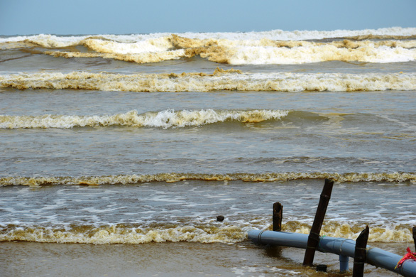 Nước biển đen ngòm và sóng biển nổi bọt váng đậm. Dù nước biển chuyển màu bất thường nhưng không có mùi hôi.