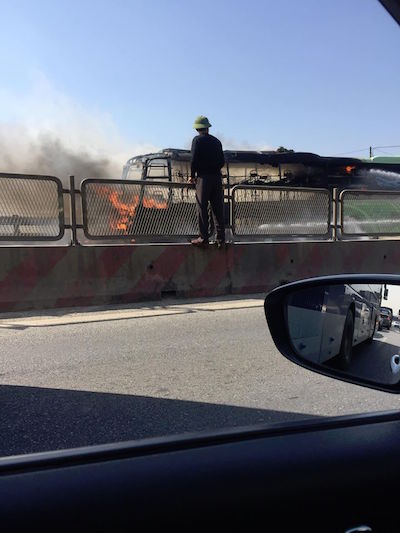 Ít phút sau, lửa bén bao trùm gần như toàn bộ chiếc xe, khói đen bốc cao hàng chục mét khiến nhiều người tham gia giao thông qua khu vực hoảng sợ.
