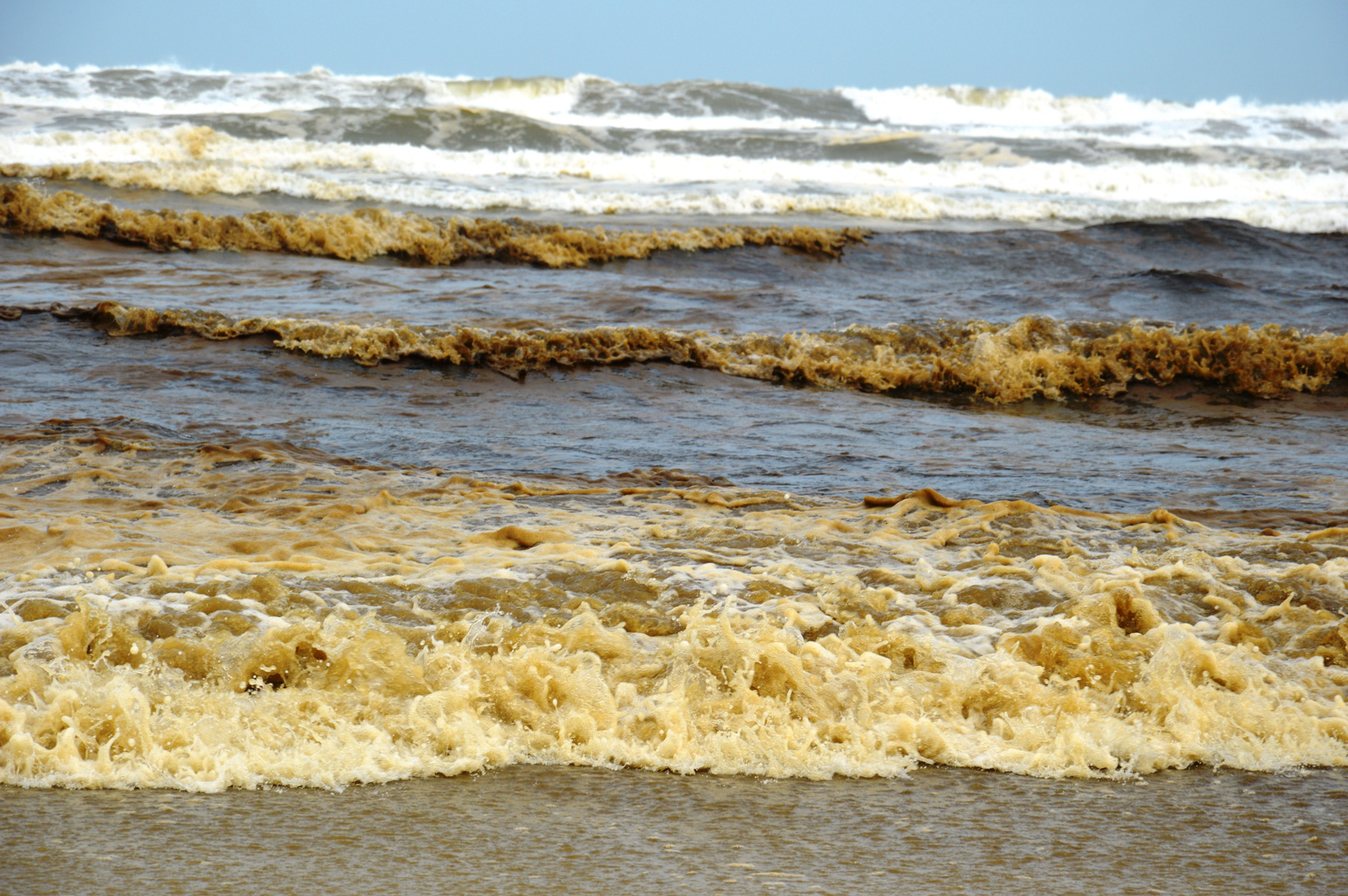 Nước biển đen ngòm và sóng biển nổi bọt váng đậm. Dù nước biển chuyển màu bất thường nhưng không có mùi hôi.