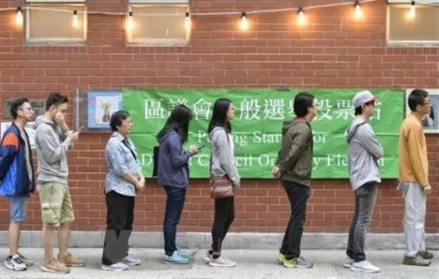 Cử tri Đặc khu hành chính Hong Kong (Trung Quốc) xếp hàng chờ bỏ phiếu tại điểm bầu cử Hội đồng cấp quận 2019 ở Hong Kong ngày 24/11/2019. (Ảnh: Kyodo)