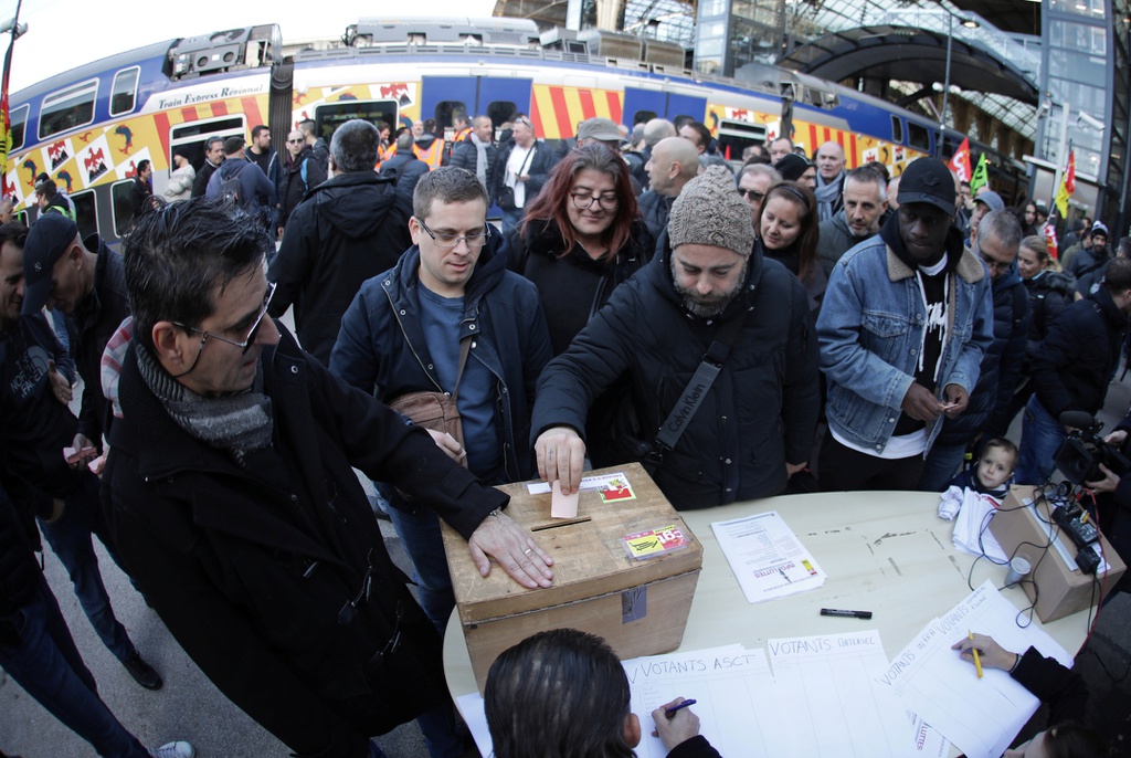Các công nhân đường sắt SNCF của Pháp bỏ phiếu đình công tại ga đường sắt Nice hôm 6/12 trong khi các công nhân ngành vận tải Pháp tiếp tục phản đối kế hoạch cải cách lương hưu của chính phủ Pháp. Ảnh: Reuters.