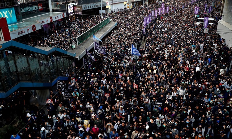 Hàng chục nghìn người biểu tình tuần hành trên đường phố Hong Kong hôm nay. Ảnh: Reuters.
