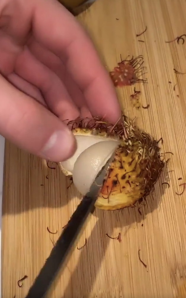 Thay vì là Google cách ăn chôm chôm đúng cách thì Gavin quyết định sử dụng dụng cụ gọt vỏ khoai tây, trước khi cắt nó bằng dao.