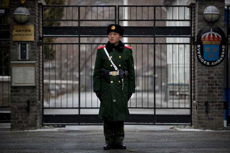 Cảnh sát đứng gác trước cổng Đại sứ quán Thụy Điển ở Bắc Kinh, Trung Quốc, ngày 14/2. Ảnh: AP.