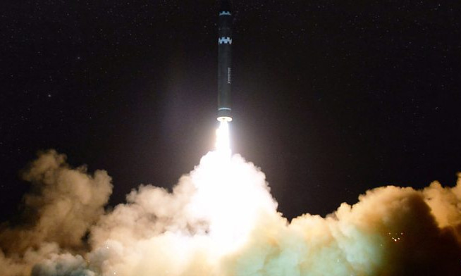 Tên lửa Hwasong-15 rời bệ phóng ngày 29/11/2017. Ảnh: KCNA.