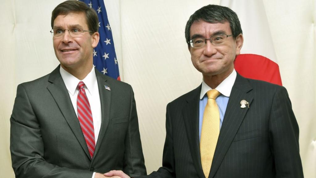 Bộ trưởng Quốc Phòng Mỹ, Mark Esper (trái) bắt tay đồng nhiệm Nhật, Taro Kono tại cuộc họp ở Bangkok ngày 18/11/2019. @THE Yomiuri Shimbun