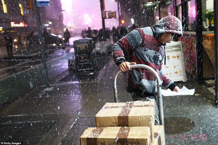 Một người giao hàng đứng dưới mưa tuyết.