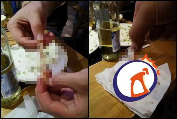 Sau khi ăn được một nửa, anh ta phát hiện một vật lạ và cho rằng là "bao cao su", và chỉ trích an toàn vệ sinh thực phẩm của nhà hàng.