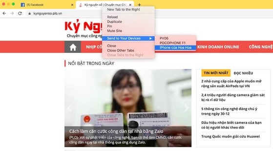Chuyển các thẻ đang mở trên máy tính sang điện thoại. Ảnh: MINH HOÀNG