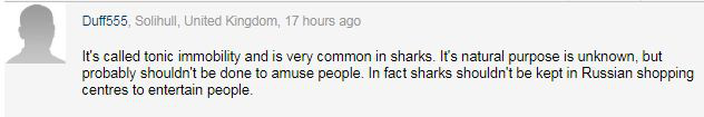 "Đây được gọi là giả chết và rất phổ biến ở cá mập. Nguyên nhân tự nhiên của điều này thì vẫn chưa được xác định tuy nhiên có một điều chắc chắn là nó không dùng để khiến con người trầm trồ. Và thực tế, việc dùng cá mập để tiêu khiển như thế này là hoàn toàn không nên."