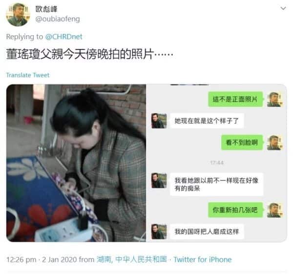 Theo Đài Á châu Tự do (RFA) đưa tin, cách đây 1,5 năm, cô gái 20 tuổi Đổng Dao Quỳnh tại Chu Châu tỉnh Hồ Nam đã đăng trực tiếp lên Twitter cảnh cô hất mực vào ảnh lãnh đạo Đảng Cộng sản Trung Quốc Tập Cận Bình, và lên án bị “kiểm soát não”. Video đăng lên mạng đã lập tức thu hút được rất nhiều sự chú ý. Tuy nhiên chỉ sau vài tiếng đồng hồ đã không rõ tung tích của cô gái này. Đến ngày 2/1/2020, sau một năm rưỡi, bố của cô gái này là ông Đổng Kiến Bưu mới gặp được con gái.