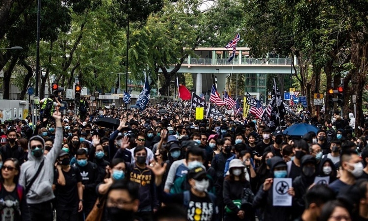 Người biểu tình tuần hành ở khu Sheung Shui, Hong Kong, ngày 5/1. Ảnh: AFP.