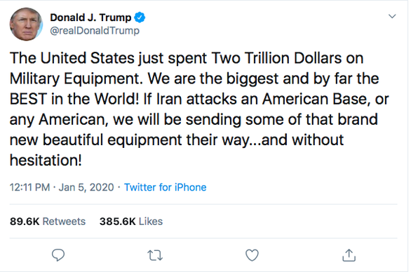 "Mỹ chi 2 ngàn tỉ USD vào thiết bị quân sự. Chúng tôi là cường quốc quân sự và đến nay đang thiện chiến nhất thế giới! Nếu Iran tấn công căn cứ quân sự Mỹ, hay người Mỹ, chúng tôi sẽ gửi họ nếm một số loại thiết bị vừa đẹp vừa mới… và không do dự đâu!", ông Trump viết trên mạng xã hội ngày 5-1.