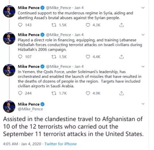 Viết trên trang cá nhân của mình hôm 5/1, sau khi cáo buộc Soleimani ủng hộ, trực tiếp đào tạo và tài trợ cho Hezbollah ở Lebanon để tiến hành các cuộc tấn công khủng bố chống lại Israel và phát động một cuộc tấn công ở Yemen nhằm vào Ả Rập Saudi, ông Pence khẳng định: “(Soleimani) từng hỗ trợ 10/12 phần tử khủng bố trong cuộc tấn công khủng bố ngày 11/9 và đã bí mật đưa các phần tử này đến Afghanistan”.