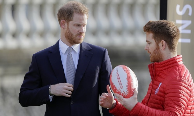 Hoàng tử Harry (trái) trò chuyện với đại sứ giải World Cup bóng bầu dục 2020 tại Điện Buckingham hôm nay. Ảnh: AP.
