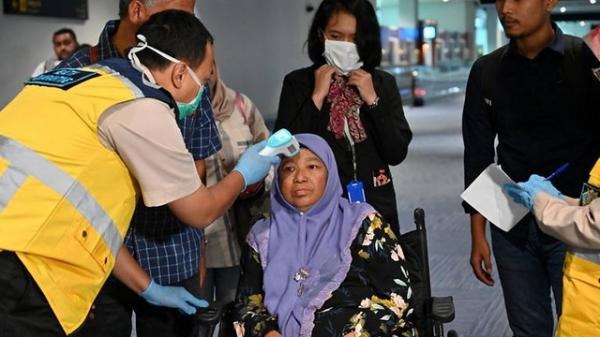 Các nhân viên y tế kiểm tra nhiệt độ của một phụ nữ Indonesia tại sân bay quốc tế Sukarno-Hatta ở Tangerang, ngoại ô thủ đô Jakarta, Indonesia (Ảnh: AFP)