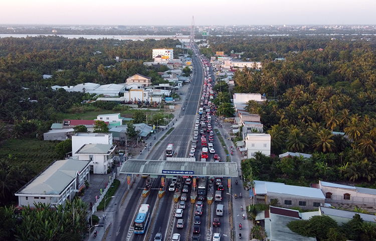 Dù trạm thu phí xả cửa, ôtô vẫn phải xếp hàng chờ qua cầu Rạch Miễu. Ảnh: Hoàng Nam.