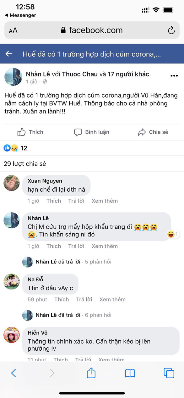 Theo đó, tài khoản Facebook Nhàn Lê đăng tải nội dung một bệnh nhân Trung Quốc ngụ ở Vũ Hán bị nhiễm virus corona và phải nhập viện và đang được điều trị cách ly tại Bệnh viện Trung ương Huế.