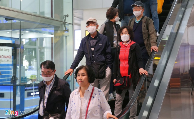 Khách nước ngoài bịt khẩu trang kín mít khi đến sân bay Nội Bài. Ảnh: Tùng Đoàn.