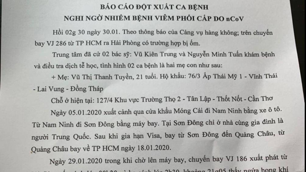 Theo đó, cảng vụ hàng không có thông báo trên chuyến bay VJ 286 từ TP Hồ Chí Minh ra Hải Phòng vào hồi 2h30 ngày 30/1 có 2 người bị ốm. Người mẹ tên là Vũ Thị Thanh T. (21 tuổi, hộ khẩu tại tỉnh Đồng Tháp, hiện tại cư trú ở Cần Thơ) cùng con là Vương Trung Bảo (17 tháng tuổi) có biểu hiện ngứa họng, khó thở, sốt, không ho, không hắt hơi...