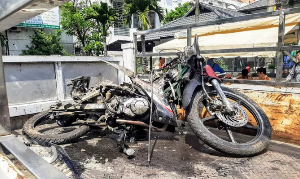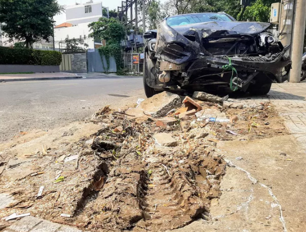 Chiếc xe sang Mercedes sau vụ tai nạn bẹp dúm hoàn toàn phần đầu, hư hỏng nặng, trong khi xe máy của nạn nhân bị vò nát, như một đống sắt. Trên mặt đường còn nhiều vết cày xới khi chiếc ôtô lao vào các nạn nhân.