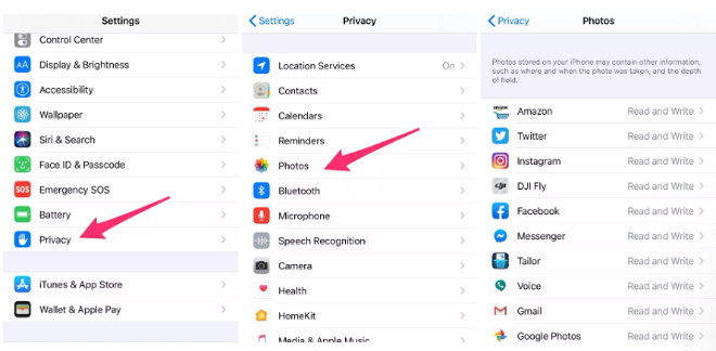 Đầu tiên, người dùng cần mở ứng dụng Cài đặt (Setting) trên iPhone và tìm tùy chọn Quyền riêng tư (Privacy). Sau đó, người dùng sẽ thấy một danh sách các tính năng và thông tin trên điện thoại với các ứng dụng phải xin phép truy cập. Danh sách này bao gồm những thứ như danh bạ, lịch, địa điểm, camera và micrô.