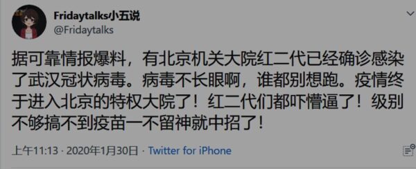 Ngày 30/1, có cư dân mạng đăng thông tin trên Twitter nói, có người thuộc thế hệ đỏ thứ hai (Hồng nhị đại) trong cơ quan lớn ở Bắc Kinh đã bị chẩn đoán xác nhận lây nhiễm virus corona Vũ Hán: “Virus không có mắt, ai cũng đừng mong chạy thoát. Dịch bệnh cuối cùng đã tấn công cơ quan đặc quyền của Bắc Kinh! Các thế hệ đỏ đều đã khiếp sợ!“