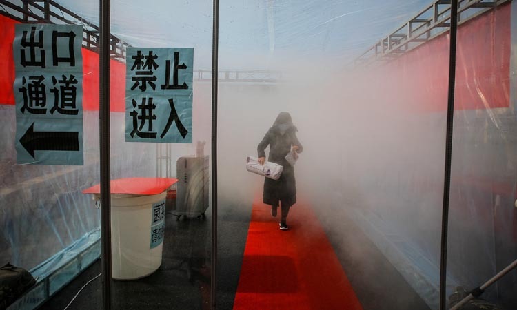 Thuốc khử trùng phun tại lối vào một khu dân cư ở Thiên Tân, Trung Quốc hôm nay. Ảnh: Reuters.
