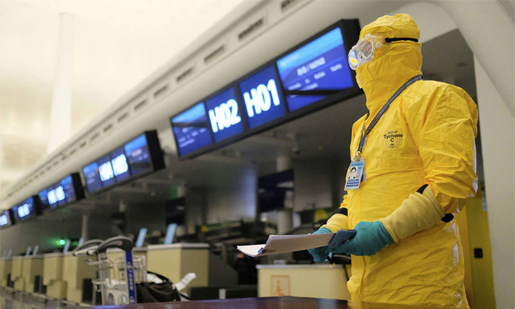 Một nhân viên ở sân bay quốc tế Thiên Hà Vũ Hán mặc đồ bảo hộ, chuẩn bị giấy tờ cho chuyến bay sơ tán các công dân Liên minh châu Âu (EU) hôm 1/2. Ảnh: AP.