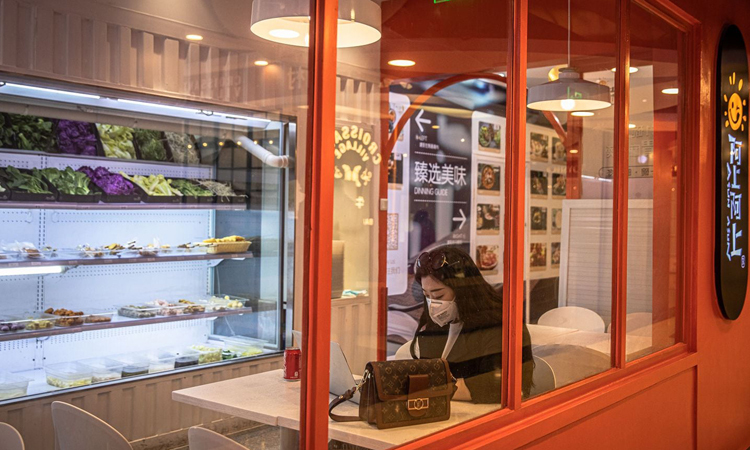 Người phụ nữ đeo khẩu trang ngồi một mình trong quán cà phê ở trung tâm thương mại Solana, Bắc Kinh hôm 12/2. Ảnh: Washington Post.