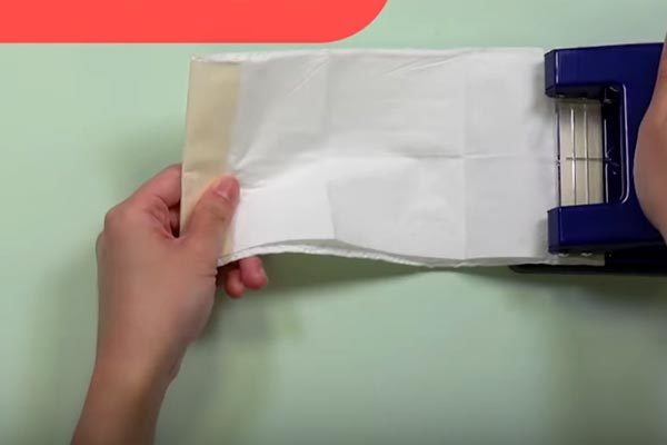 Sau đó, bạn lấy một tờ khăn giấy sạch đặt lên trên chúng để làm lớp dưới cùng của khẩu trang. Cắt tệp giấy làm đôi và lấy một nửa.