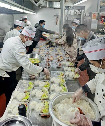 Shen cho biết các đầu bếp phải dậy lúc 7h sáng mỗi ngày để chuẩn bị nấu nướng. Đến 13h30, 13 tình nguyện viên sẽ đến chuyển đồ ăn đi. Mỗi phần cơm có hai món thịt và một món rau, đảm bảo cân bằng dinh dưỡng.