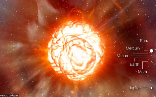 Ảnh đồ họa cho thấy ngôi sao đỏ khổng lồ khi phát nổ được so sánh với các thiên thể trong Hệ Mặt trời - chỉ như những chấm nhỏ - ảnh đồ họa từ ESO