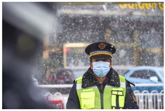 Một cảnh sát giao thông đeo khẩu trang làm việc trên một con phố ở Hồ Bắc. (Ảnh: Tân Hoa xã)