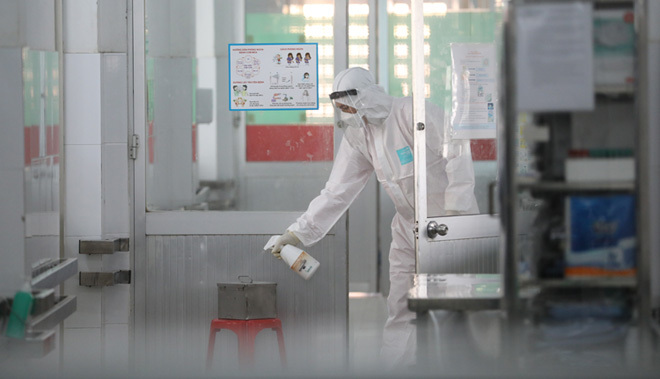 Bác sĩ Bệnh viện Chợ Rẫy khử trùng dụng cụ y tế trước khi đưa ra khỏi phòng điều trị cách ly bệnh nhân. Ảnh: Hữu Khoa.