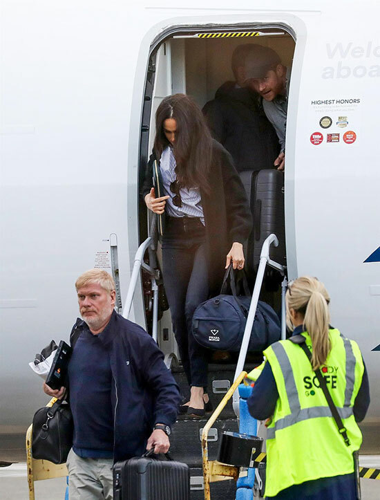 Meghan trông giống một doanh nhân khi cô ôm túi máy tính xách tay và tập tài liệu. Còn Harry xách vali theo sau vợ.