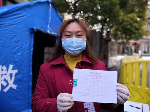 Một người dân với giấy thông hành ở quận Giang Hán, thành phố Vũ Hán, tỉnh Hồ Bắc. Chính quyền tại đây cho phép mỗi gia đ́nh cử một thành viên ra ngoài khu vực cư trú để mua hàng hóa ba ngày một lần.