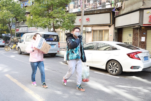 Người dân Vũ Hán đi mua sắm nhu yếu phẩm. Kể từ tháng 1, toàn tỉnh Hồ Bắc nói chung và thành phố Vũ Hán nói riêng đă bị phong tỏa. Phương tiện bị cấm lưu thông và mọi hoạt động của người dân đều bị hạn chế.