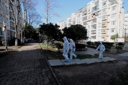 Một viên chức địa phương phun thuốc khử trùng tại Vũ Hán. Trước đó, 1.400 chiến sĩ quân y cũng được điều động đến Vũ Hán hỗ trợ chống dịch Covid-19. Hiện quân đội đang phụ trách trực tiếp hai bệnh viện dă chiến Hỏa Thần Sơn và Lôi Thần Sơn mới đi vào hoạt động hồi đầu tháng 2 tại Vũ Hán.