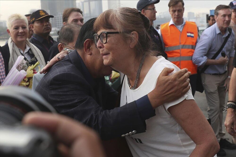 Ông Hun Sen chào đón thân mật một nữ du khách từ tàu MS Westerdam.