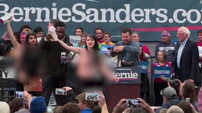 Khi vị ứng viên tổng thống 78 tuổi vừa kết thúc màn giới thiệu vợ của mình sẽ là “đệ nhất phu nhân tương lai” thì một phụ nữ trẻ tiến lên bục phát biểu trên sân khấu và cố gắng nắm lấy micro của ông. Vị ứng viên đảng Dân chủ giận dữ nắm chặt micro, kéo ra khỏi tay của “kẻ chen ngang” nhưng người này lại nắm lấy một chiếc micro khác và bắt đầu chỉ trích ông Sanders về việc nâng đỡ ngành công nghiệp sản xuất sữa. Ngay lúc đó, một số cô gái khỏa thân một phần xông vào sân khấu.