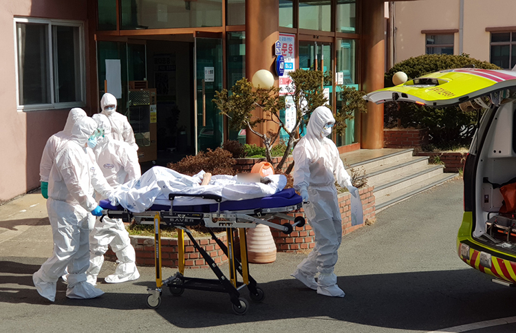 Các bác sĩ tiếp nhận một bệnh nhân nhiễm nCoV ở quận Cheongdo, tỉnh Bắc Gyeongsang, Hàn Quốc. Ảnh: Yonhap